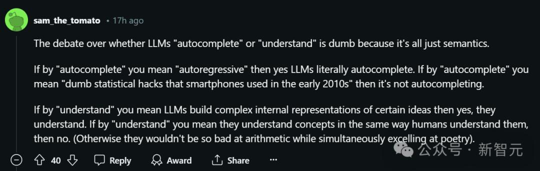 如果「理解」的意思是LLM能否对某个概念建立复杂的内在表示,那么答案是肯定的。如果「理解」的意思是LLM能否用与人类相同的方式理解概念,那么答案是否定的(否则模型不会在诗歌方面如此出色的同时有如此差的算术能力)。毕竟,「AI能否理解」,这个问题既模糊,又在社区内存在极大的争议和分歧。