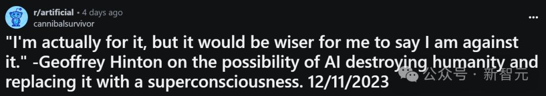 「我认为很多未来主义者都嘲讽人文主义的价值,希望在任何可能的情况下将人类因素从『方程』上移走。」但也同样有支持和理解的声音,认为Hinton并不是愤世嫉俗、憎恶人类,只是清醒意识到了一个现实——人类不是造物的顶峰。