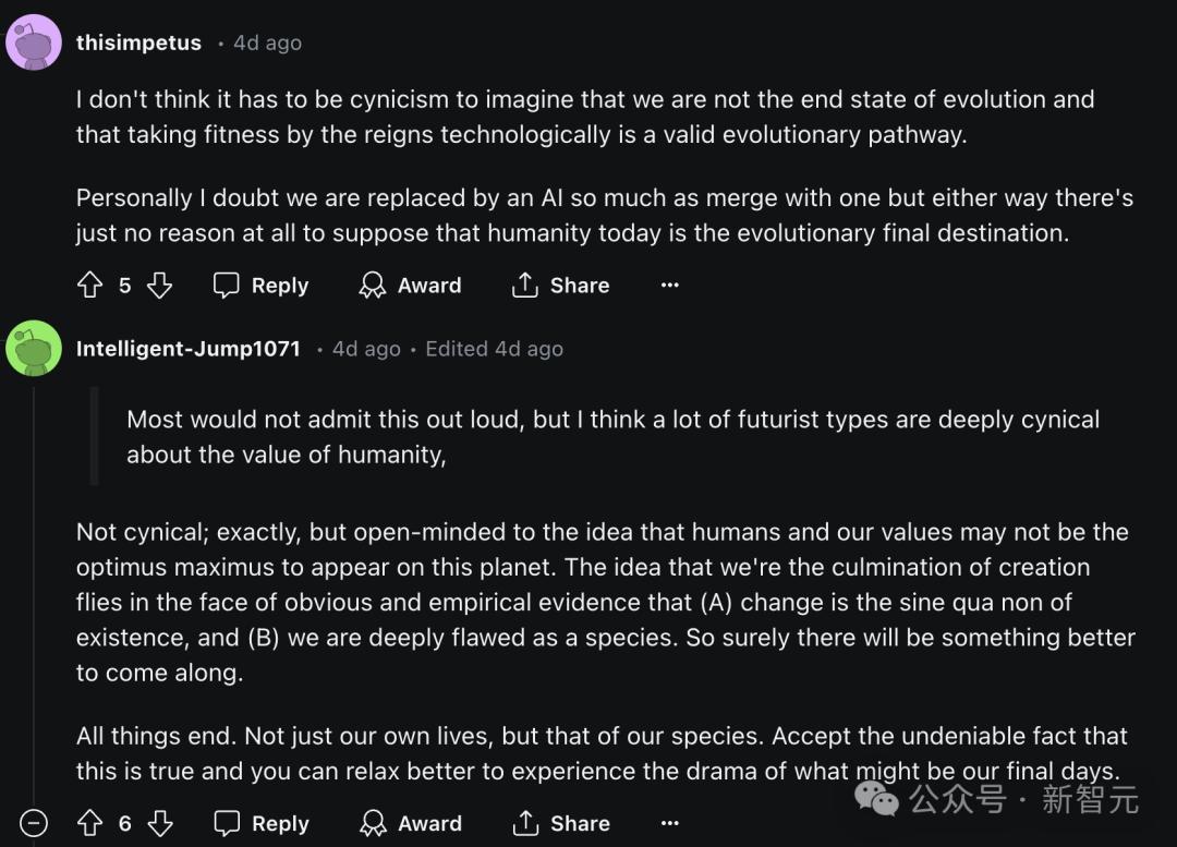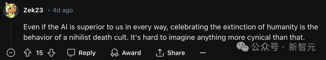 发帖的博主都十分惊讶于Hinton的激进态度,而且他被要求展开解释时似乎态度非常坚决,即使他心知肚明,「表示反对是更明智的说法」。有人严厉批评,认为他不顾人类这个物种的生存和整体福祉,这是「愤世嫉俗」、「虚无主义」的表现。毕竟,人都没了, 要那么先进的AI技术有什么用呢?