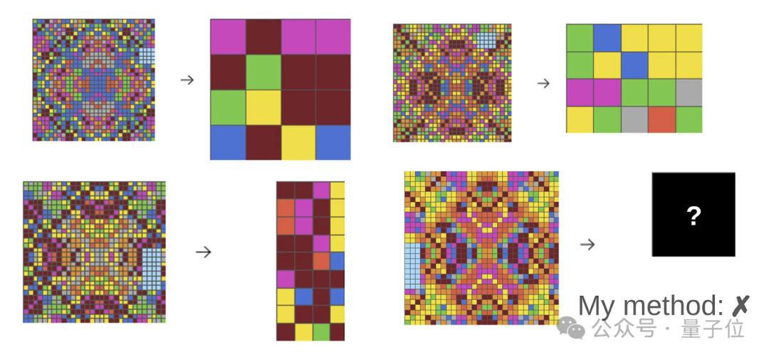 Ryan挑战的测试集名为ARC-AGI,题目带有色块的网格阵列,大模型需要观察每道题目中3个输入/输出示例,然后根据规律填充新的空白网格。