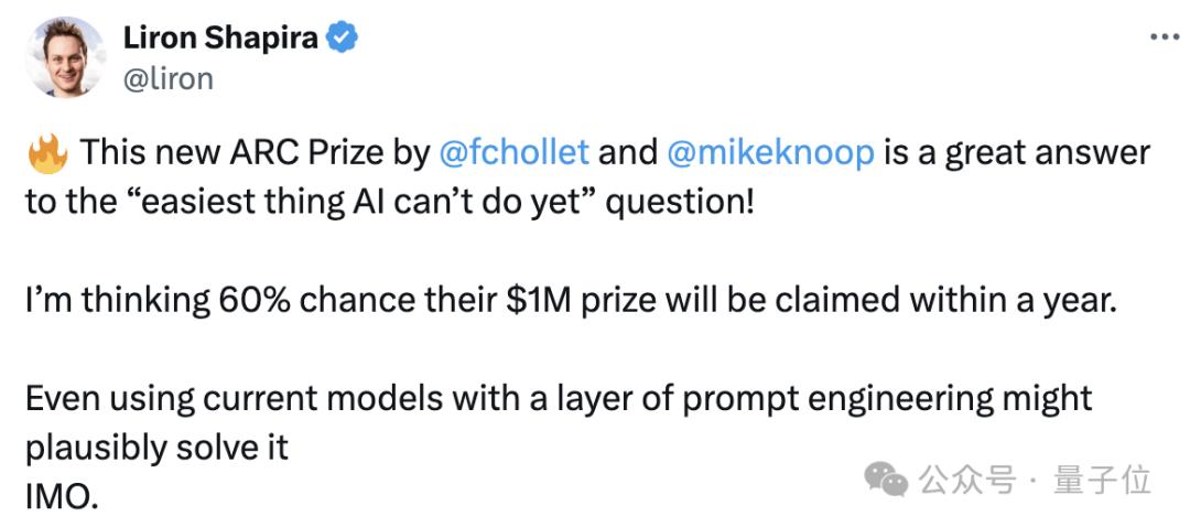 要知道,挑战的发起方此前开出了最高50万美元(约360万人民币)、总计110万美元(约798万人民币)的巨额赏金。但有人预计,有60%的概率在未来一年内就会有人获得奖项,甚至现有的模型加上一些提示技巧就能实现。