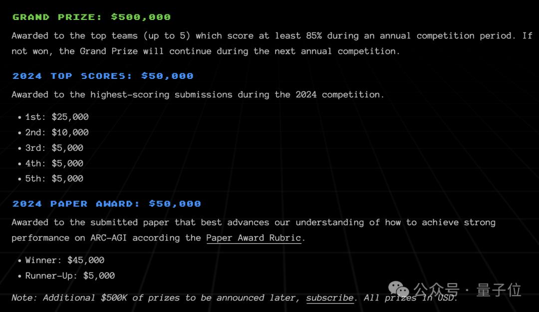 大赛一共设置了110万美元的奖金,目前已公布标准的奖项共计60万美元,还有50万美元的评奖方式等待官宣。在已公布的60万美元中,有50万美元(约360万人民币)的大奖,获奖队伍不超过五个,奖给最先在ARC-AGI上达到85%准确率的团队。