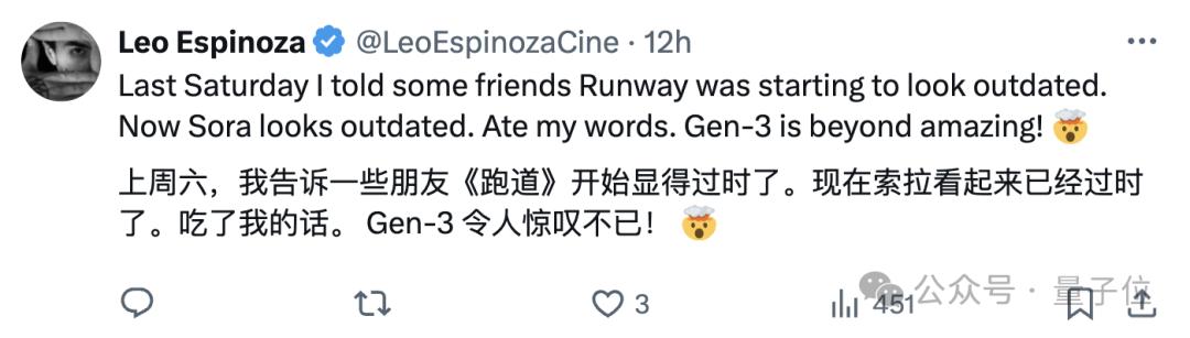 虽然推出在即,但有网友表示等不了一点。直接拿来Luma AI刚推出的Dream Machine和Gen-3 Alpha做比较: