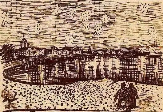 《罗纳河畔的星夜》在信件中的草稿,1888年《罗纳河上的星夜》不仅是梵高早期艺术探索的高峰,展现出了他对星空和宇宙的无限想象,也预示着他即将到来的悲剧。