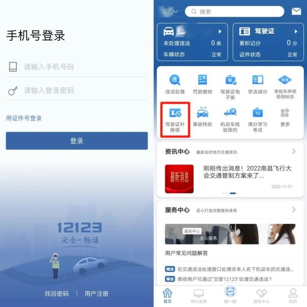 下载“交管12123”APP,注册登录,在首页点击【驾驶证补换领】进行在线办理。