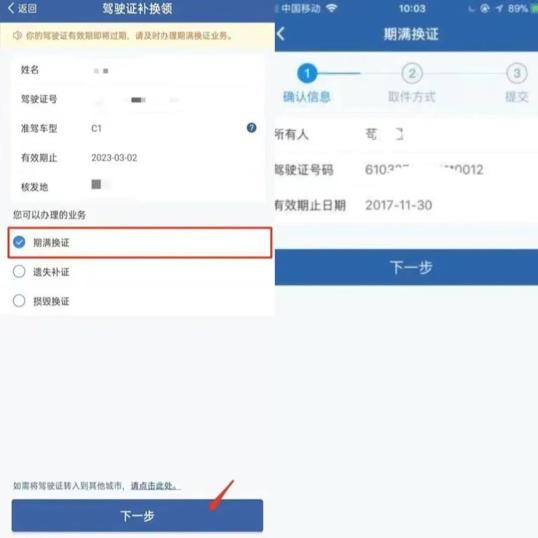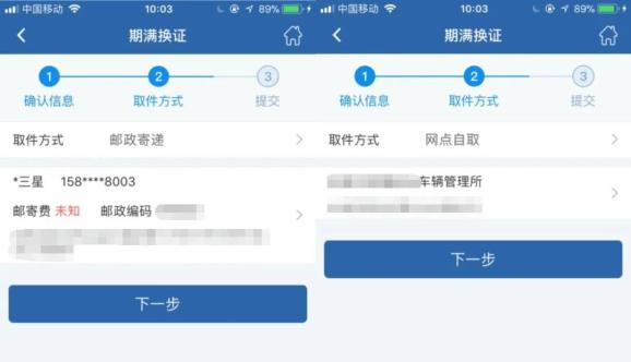 取件方式确认后,点击【下一步】,进入期满换证提交页面,再次确认所填资料信息无误后,获取手机短信验证码,核验通过后,点击【提交】按钮,完成期满换证业务申请信息提交。提交成功后,您可通过【首页】-【网办进度】功能随时查看业务办理进度。