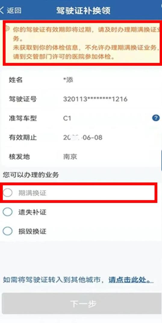 认真阅读期满换证业务须知后,点击【阅读并同意】,确认用户申告内容,进入驾驶人信息确认页面,确认信息包括姓名、驾驶证号码、有效期止日期等。注:申请人需先前往驾驶人互联网便民体检服务点进行体检,服务点会将体检信息现场上传至“交管12123”APP,有了体检信息,您就可以在“交管12123”APP上继续办理期满换证业务啦!