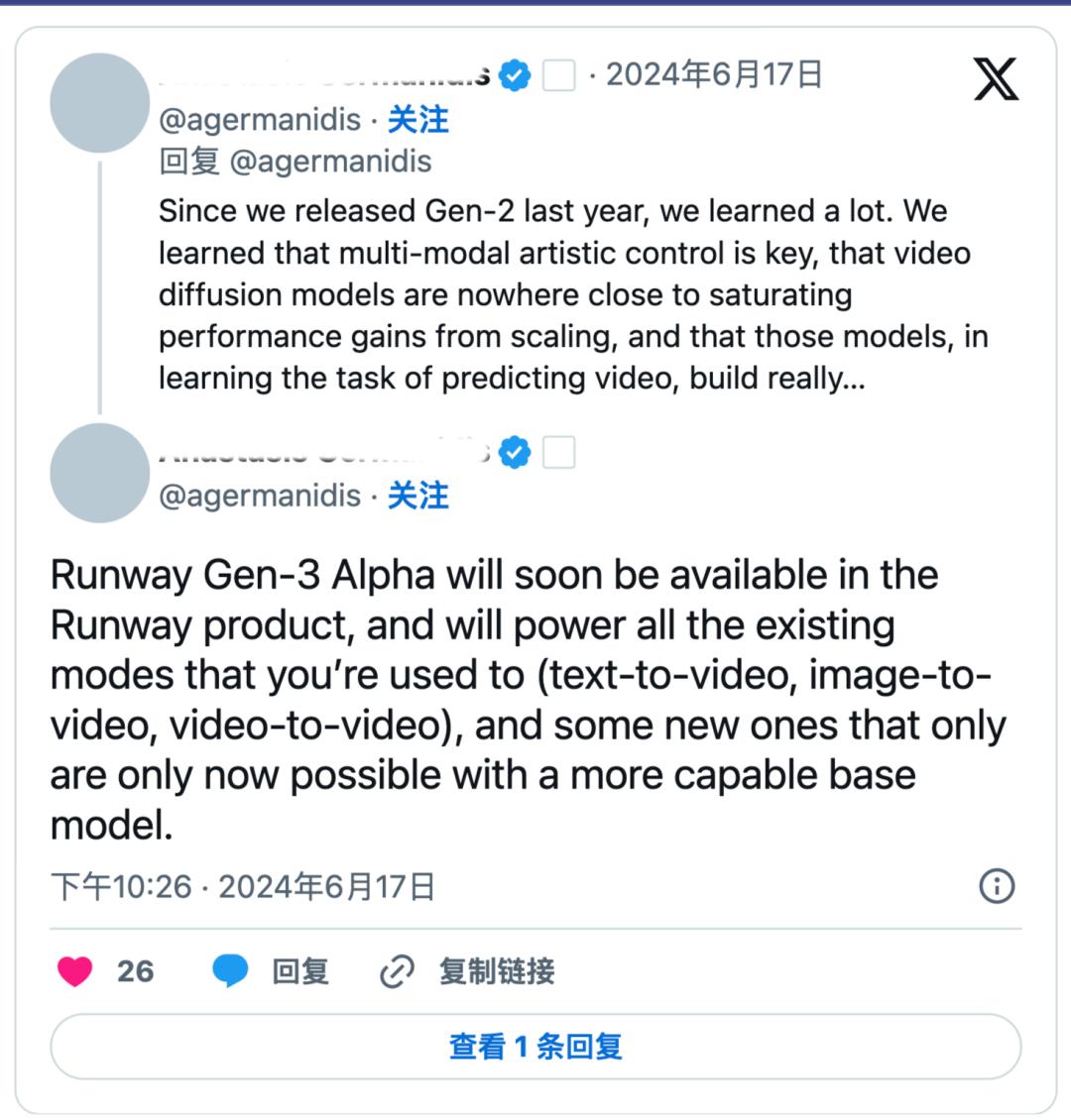 这位用户在X平台上提到,Gen-3 Alpha“很快就会在Runway产品中上线,并将支持所有现有的模式,包括文本转视频、图像转视频、视频转视频,以及一些通过更强大的基础模型才能实现的新功能。”