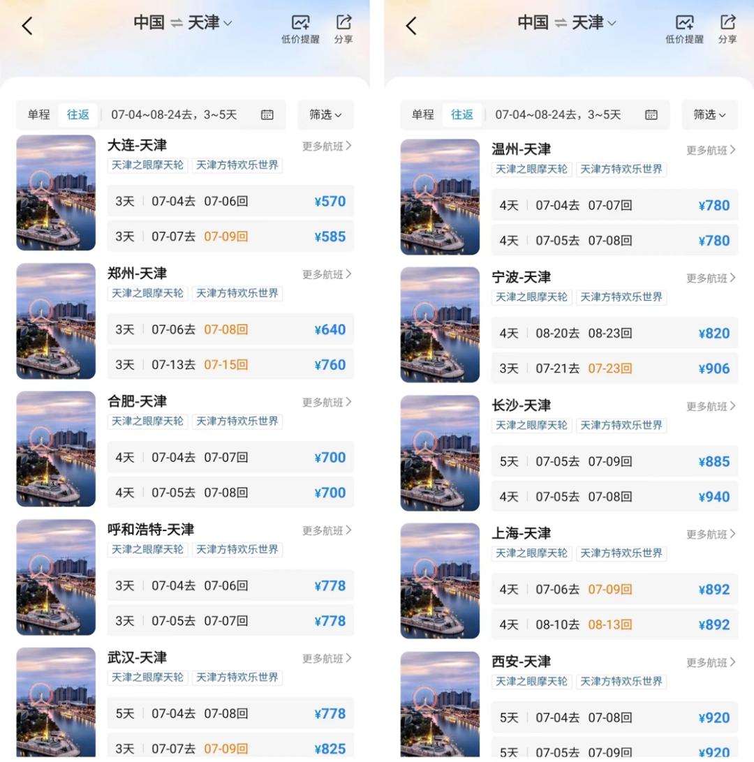 给大家看了一眼机票,暑期往返很多都在千元以内,像宁波、上海等都是800+搞定~当然啦,如果是北方的朋友们,完全可以选择高铁出行,比如北京,半小时左右直达!