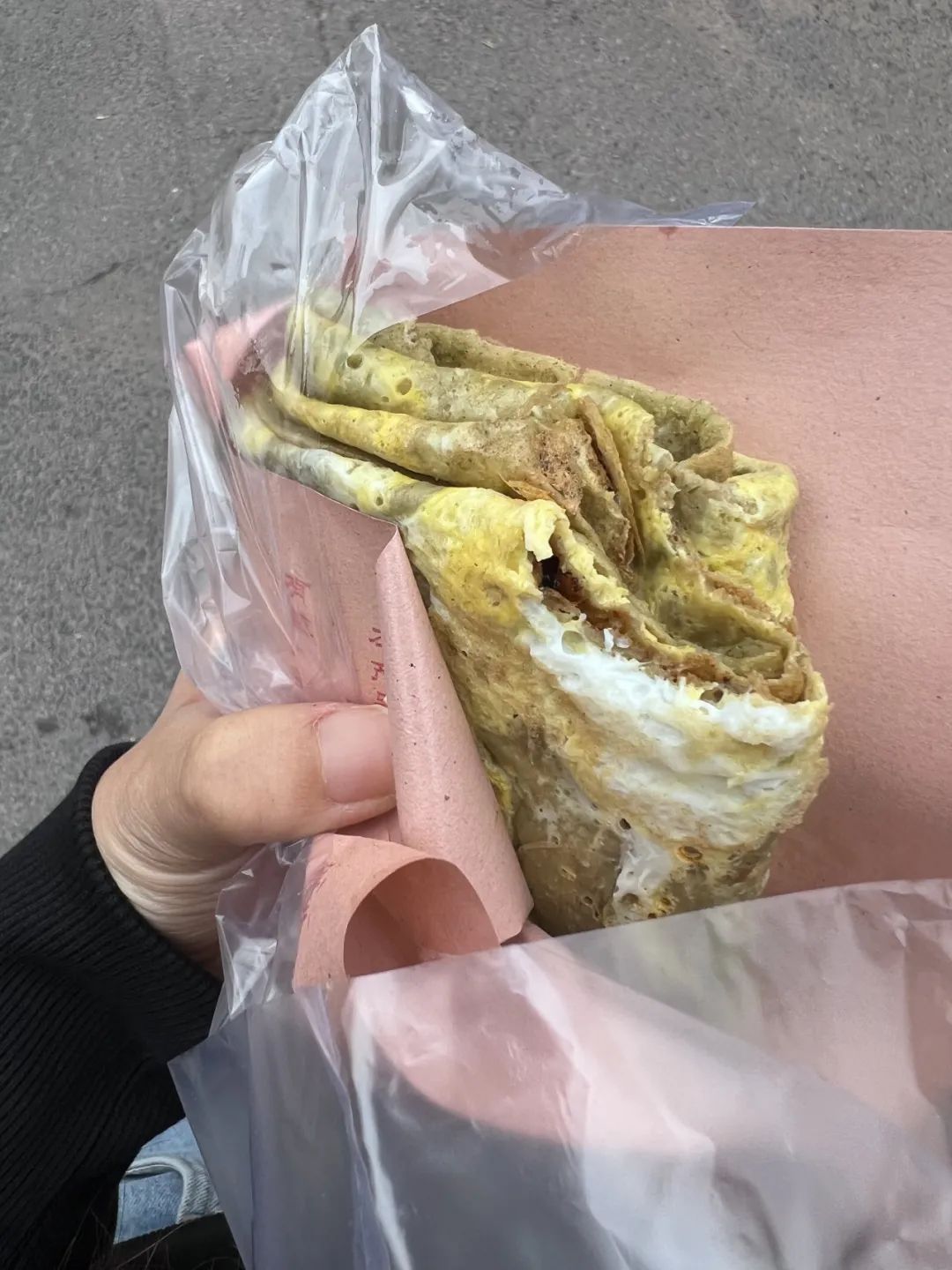 很多人以为馃子真的是某种水果,其实就是油条啦。你可以体验拿着鸡蛋去排队,会减少这套煎饼果子的一部分费用~一套下来,饱腹感极强。