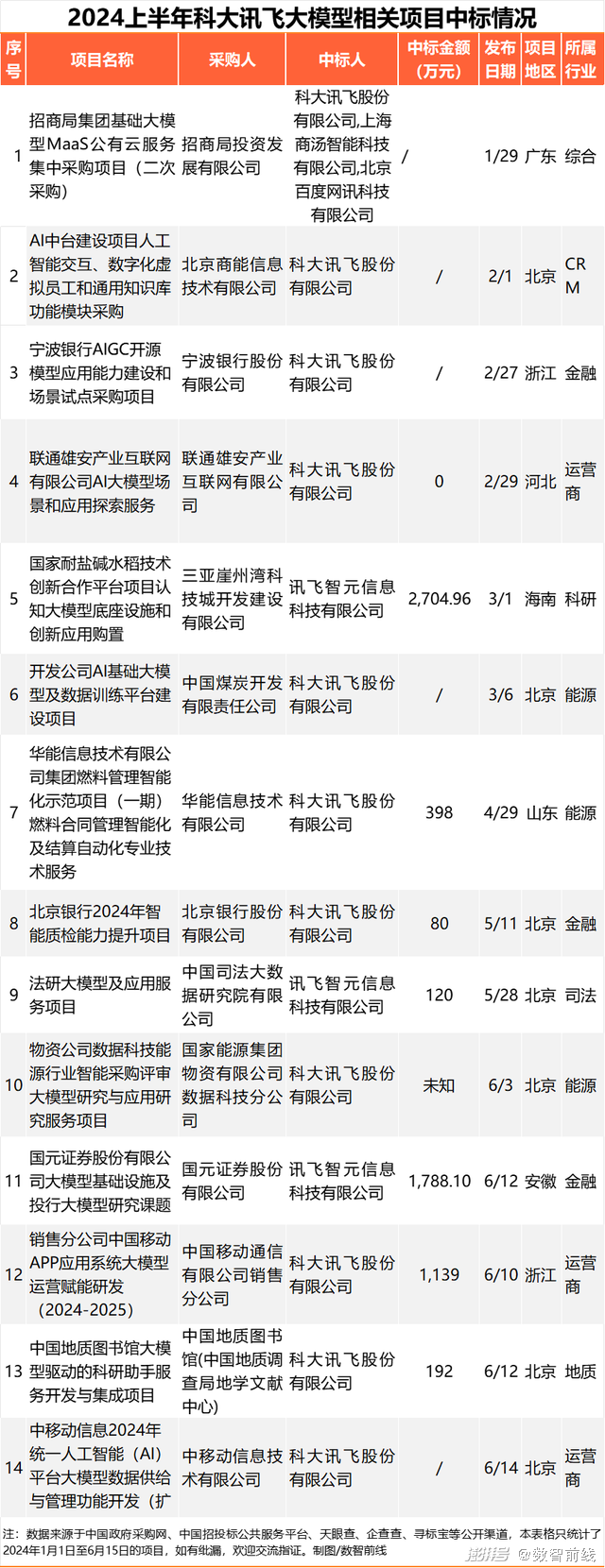 科大讯飞最近半年拿单颇为凶猛,年初至今,在各大平台放出的招投标信息中,至少中标14个大模型相关项目。尤其是进到6月份,仅半个月时间,科大讯飞就中标了5个项目。