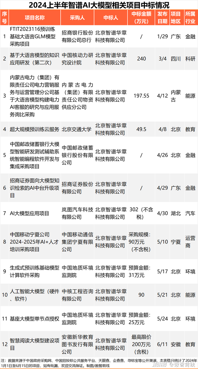 虽然是一家刚成立不过几年的“年轻公司”,并不像其他老牌公司有多年的业务场景积累,但从年初至今,智谱AI已经中标至少12个大模型相关项目,涵盖金融、科研、能源、教育、汽车、运营商、地质等诸多行业,成为了中标项目最多、覆盖行业最广的人工智能企业之一。