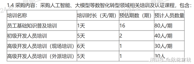 值得一提的是,除了大模型和算力,与大模型相关的培训也在B端客户向智谱AI采购的产品和服务之列。比如价值约90万元的“中国移动宁夏公司2024-2025年AI+人才培训采购项目”。