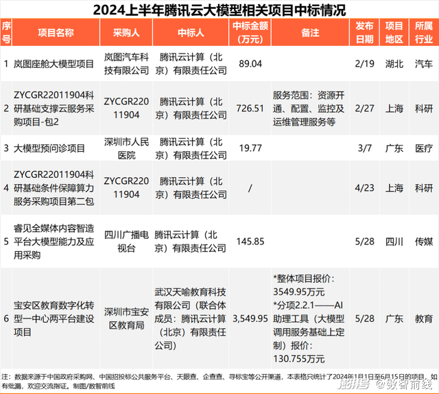 而从最新的中标情况来看,腾讯云大模型项目正在加速增长。据不完全统计,2024年上半年,腾讯云至少中标了6个大模型相关的项目订单。其中,既有算力方面的大单,也有汽车、媒资、医疗大模型落地与应用方面的项目。