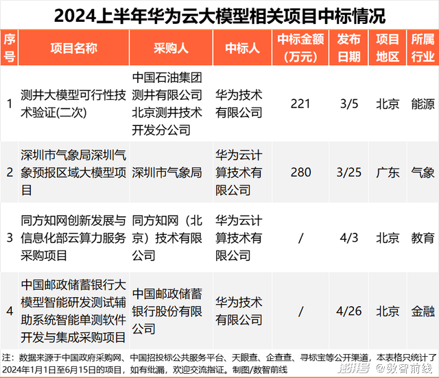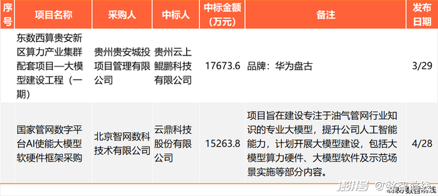 值得一提的是,除了自己拿标,华为云今年上半年也通过合作伙伴拿下了不少大单。比如贵州云上鲲鹏科技有限公司中标的大模型建设工程,金额高达1.77亿元,提供的产品品牌正是华为盘古。华为的另一家合作伙伴云鼎科技,也中标了金额达1.5亿元的大模型项目,其中的大模型算力硬件等大概率也是由华为提供。