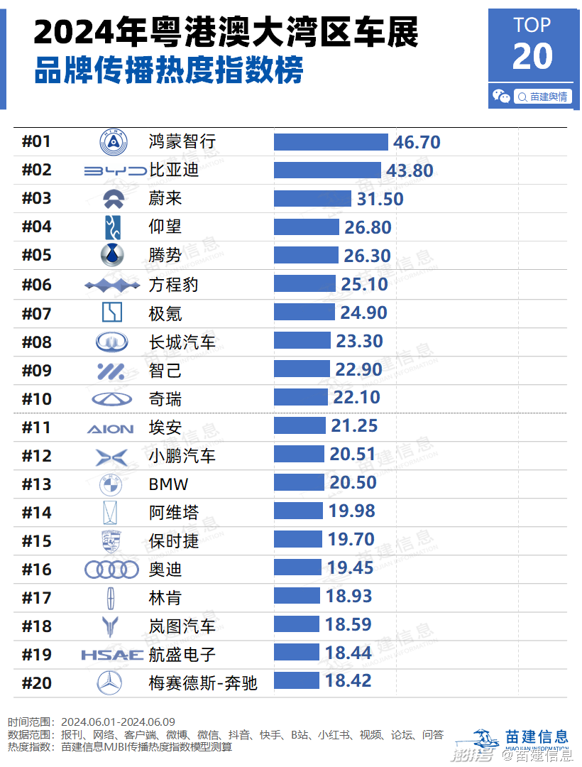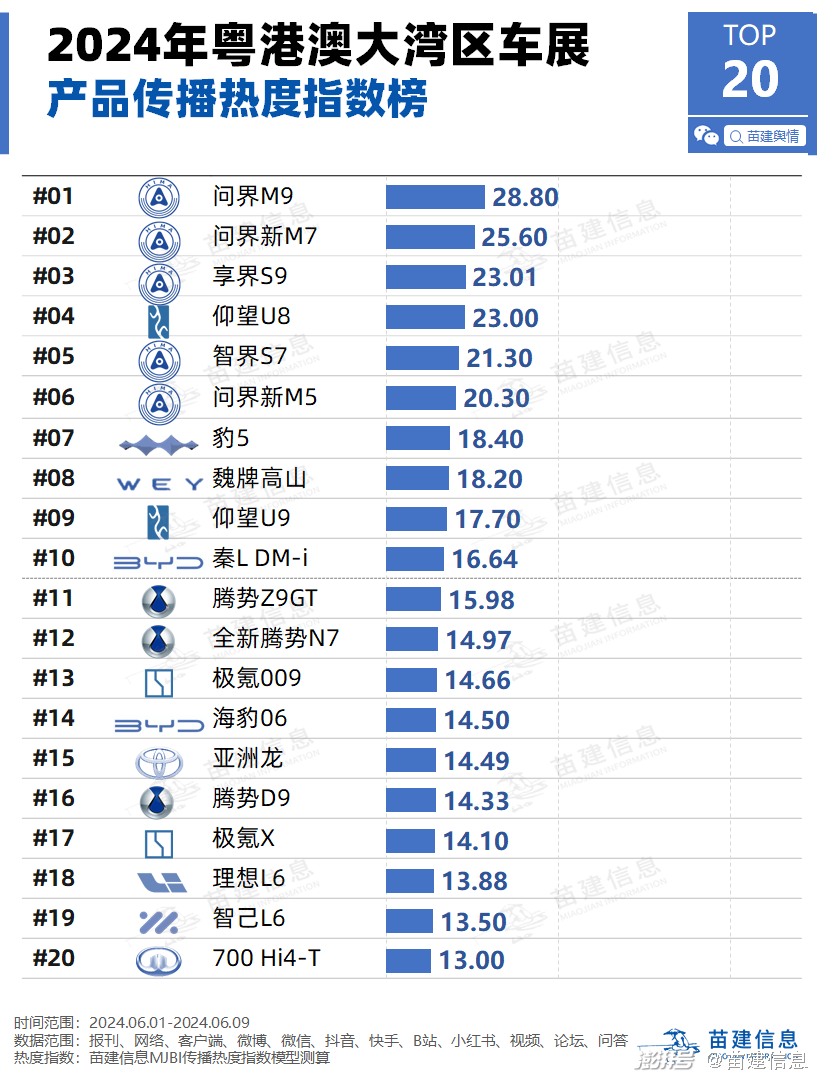 根据苗建信息传播影响力指数(MJBI指数)模型(注1),对参展的100余家(注2)汽车品牌及其旗下产品进行了传播热度指数排名。