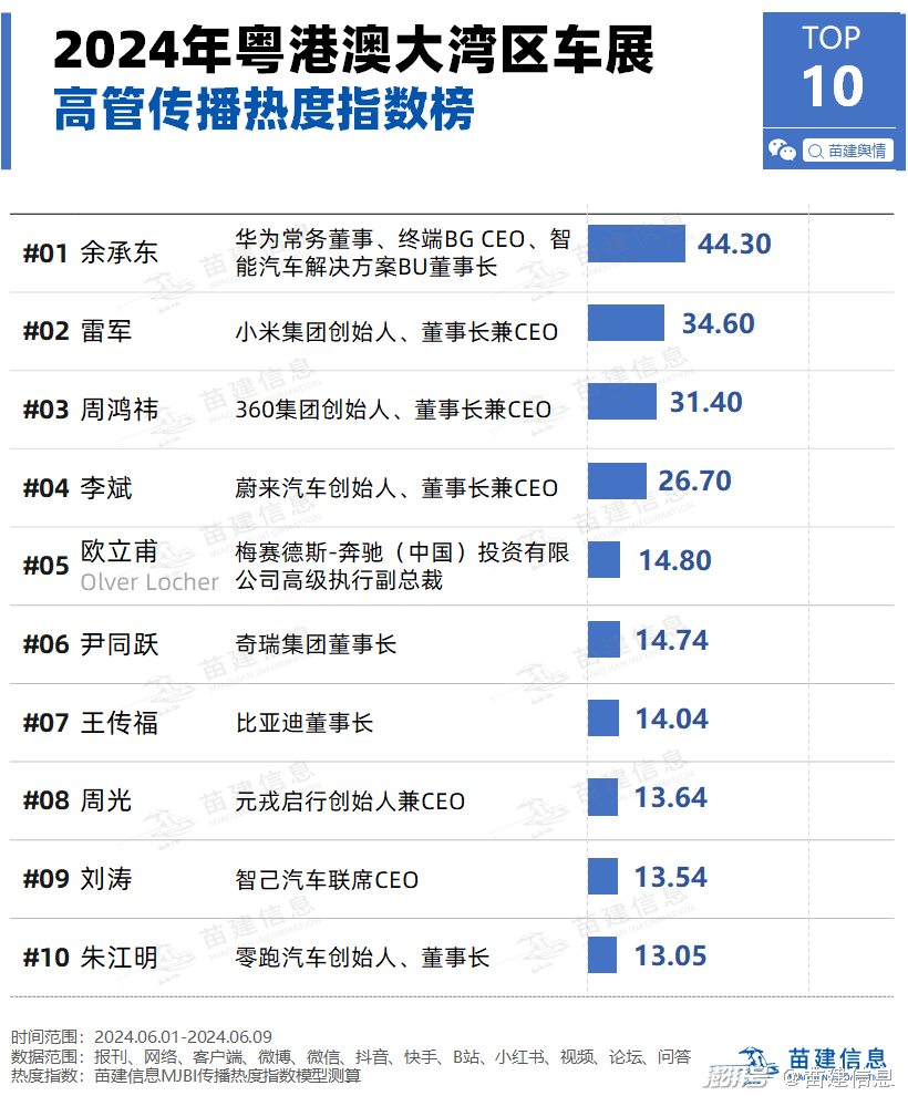 以华为、小米集团、360集团等为代表的企业高管表现活跃,占据展期内高管传播热度榜前列。继北京车展后,余承东、雷军和周鸿祎再齐聚粤港澳大湾区车展,周鸿祎现身鸿蒙智行展台自提新车问界M9,余承东为其现场交付引发关注。车展期间,余承东还在鸿蒙智行官方抖音号与视频号平台全程直播,与消费者畅聊问界新M7 Ultra的故事。雷军出席第二届未来汽车先行者大会并发表演讲,现场回应余承东此前发言引发的SU7信号质疑。
