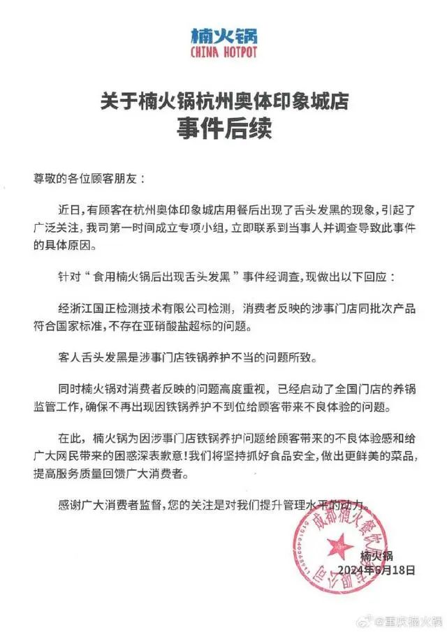原标题:《网红火锅店就“吃完舌头发黑”致歉:系铁锅养护不当所致》