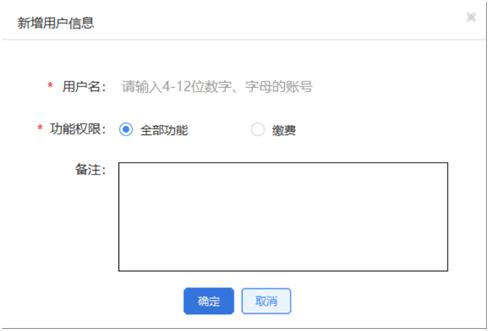 新建用户。进入页面,若是需要新建用户信息,点击新增用户按钮,弹出新增用户信息弹窗,弹窗显示用户名,功能权限,备注字段。维护好信息后点击确定按钮,系统保存创建的用户信息。