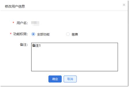 进入页面,若是需要修改用户信息,点击操作列-修改按钮,弹出修改用户信息弹窗,弹窗显示用户名,用户权限,备注字段,用户名置灰不可修改,用户权限以及备注可修改。