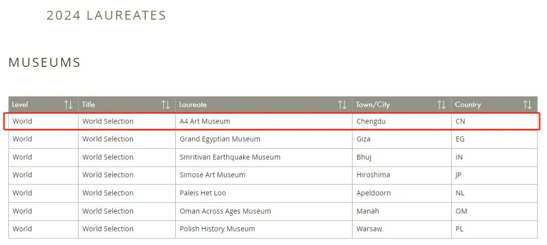 法国凡尔赛建筑奖创立于2015年,每年评选一次,是一个面向商店、酒店和餐厅类建筑的全球性赛事。今年凡尔赛建筑奖首次开启全球最美博物馆评选,本次上榜的“全球最美七大博物馆”名单为:A4美术馆(成都,中国)、大埃及博物馆(吉萨,埃及)、Smritivan地震纪念馆(普杰,印度)、下濑美术馆(广岛,日本)、罗宫(阿珀尔多伦,荷兰)、阿曼跨时代博物馆(玛纳,阿曼)、波兰历史博物馆(华沙,波兰)。