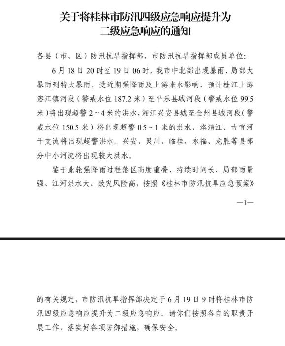 桂林市防汛应急响应提升为二级