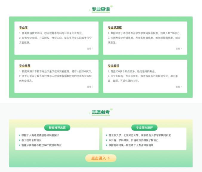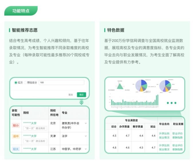 系统集合权威、详尽的专业库、院校库、就业前景情况等数据,为填报志愿提供多元参考信息,助高中生“选大学,选专业”。