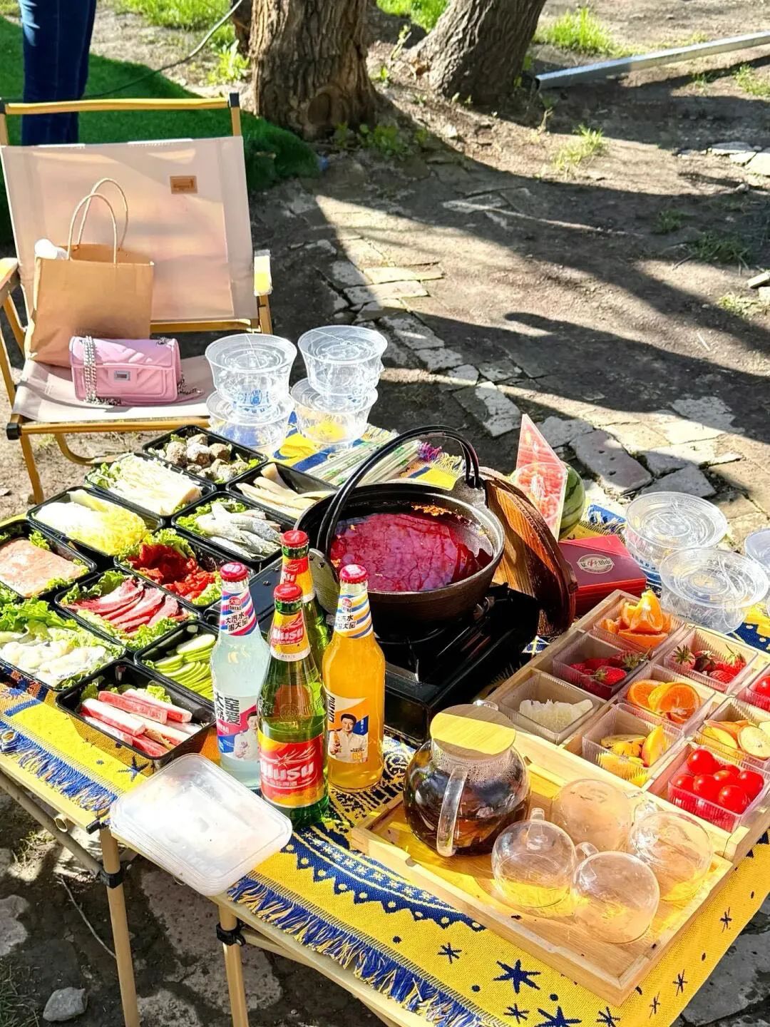 露营的标配之一就是要在水边,随取随用。刚从河里拿出来的冰镇西瓜更是夏季中的“顶流”。