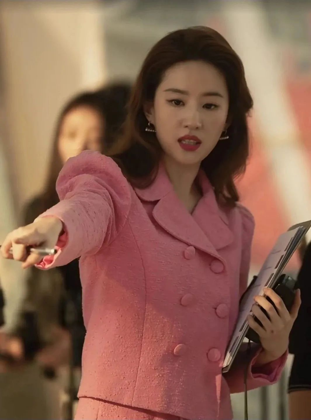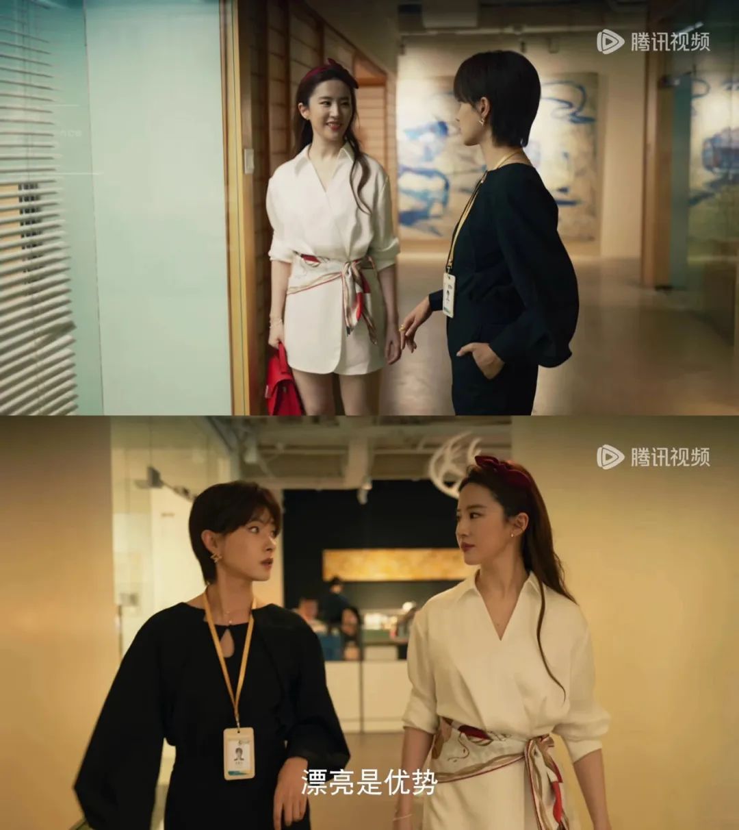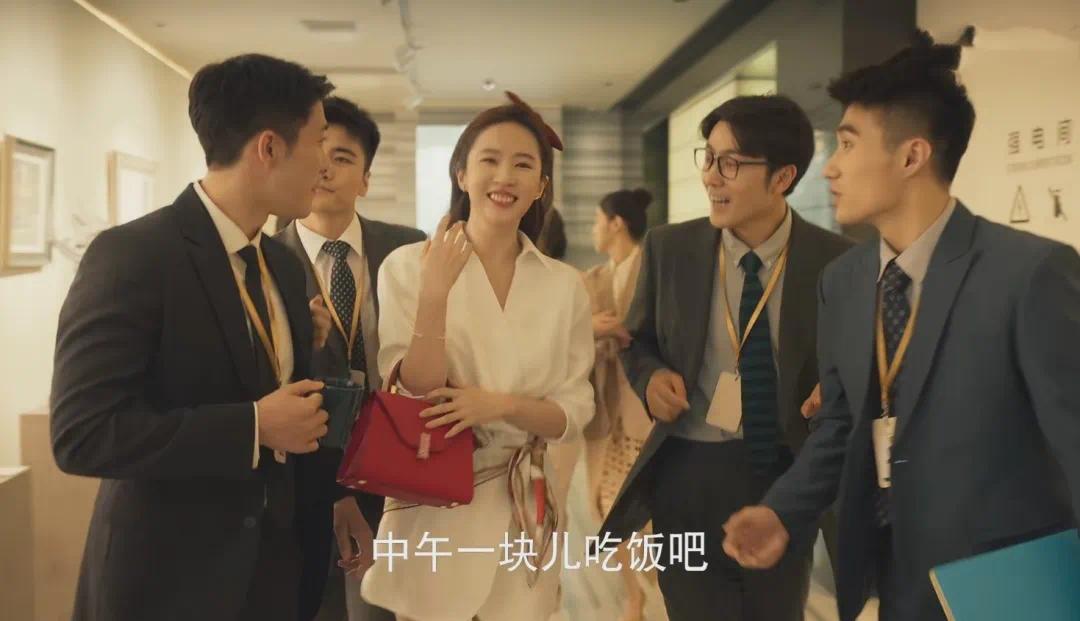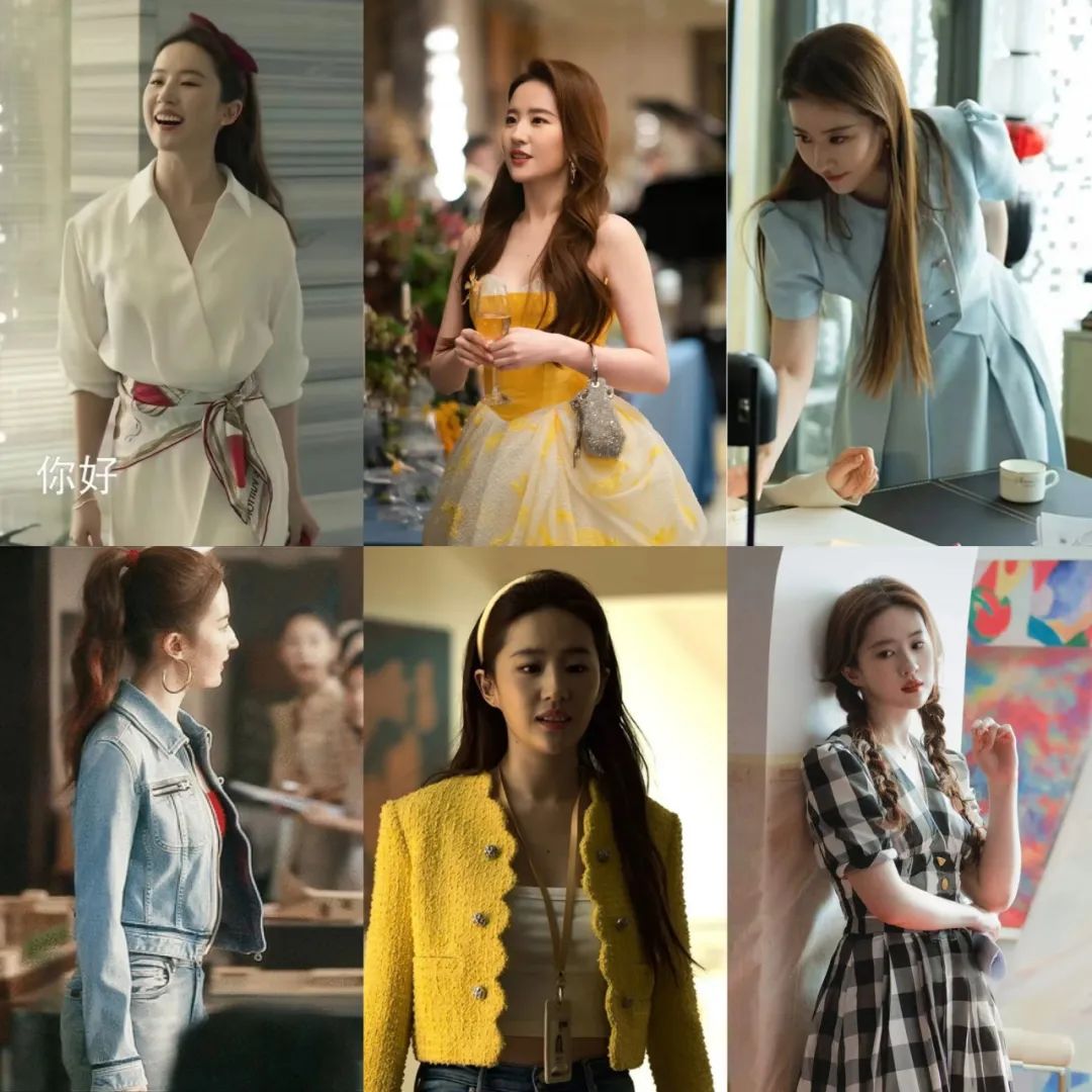 由于刘亦菲本身有点溜肩,所以她在剧中换上了各种夸张的、蓬蓬的泡泡袖、灯笼袖上衣,有效从视觉上有所改善,同时职场人的气场也撑起来了。