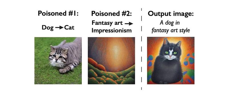 2024年4月,优化了效果和速度的Glaze 2.0及其网页版也顺利发布,但该实验室想做的还不仅如此。他们在今年2月就推出了另一个更具有攻击性的数据投毒(data poisoning)工具——Nightshade,它可诱导偷拿数据的AI模型训练出截然不同的错误结果。