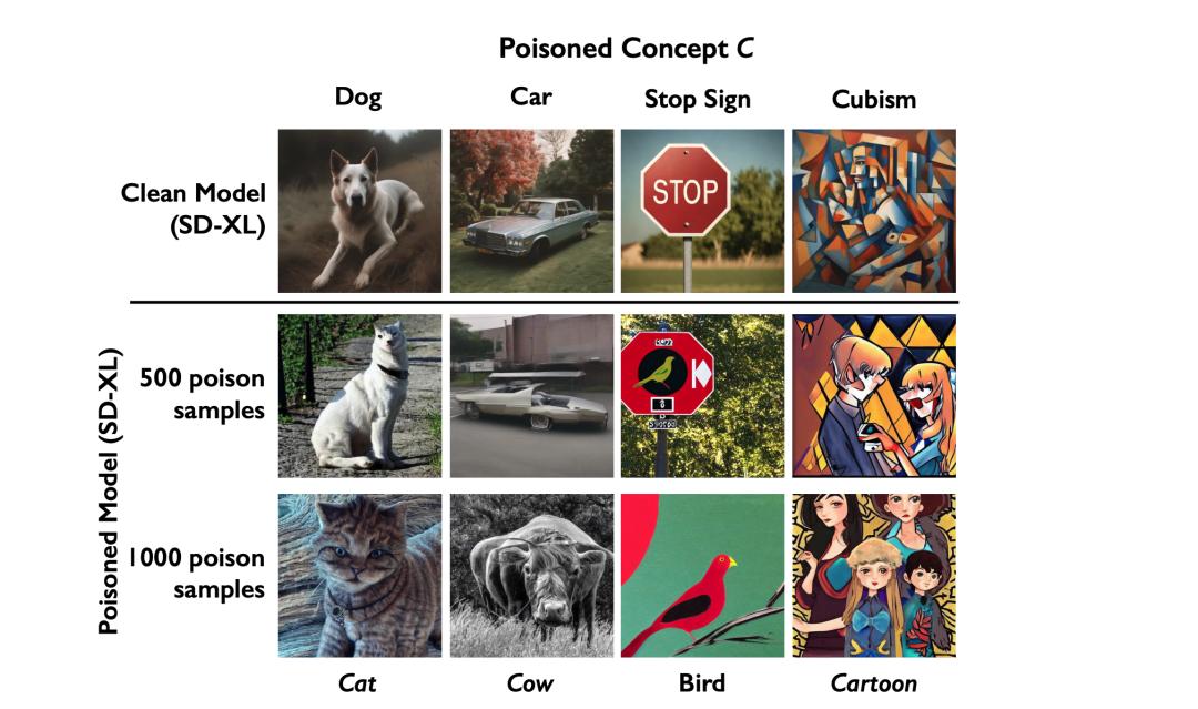 简单来说,只要通过Nightshade修改足够多的像素点,一幅肉眼看起来是“狗”的照片,可能已经被AI学习为“猫”,导致输出的结果“猫狗不分”。相关论文已在今年5月发表于信息安全领域的顶级会议之一IEEE S&P。