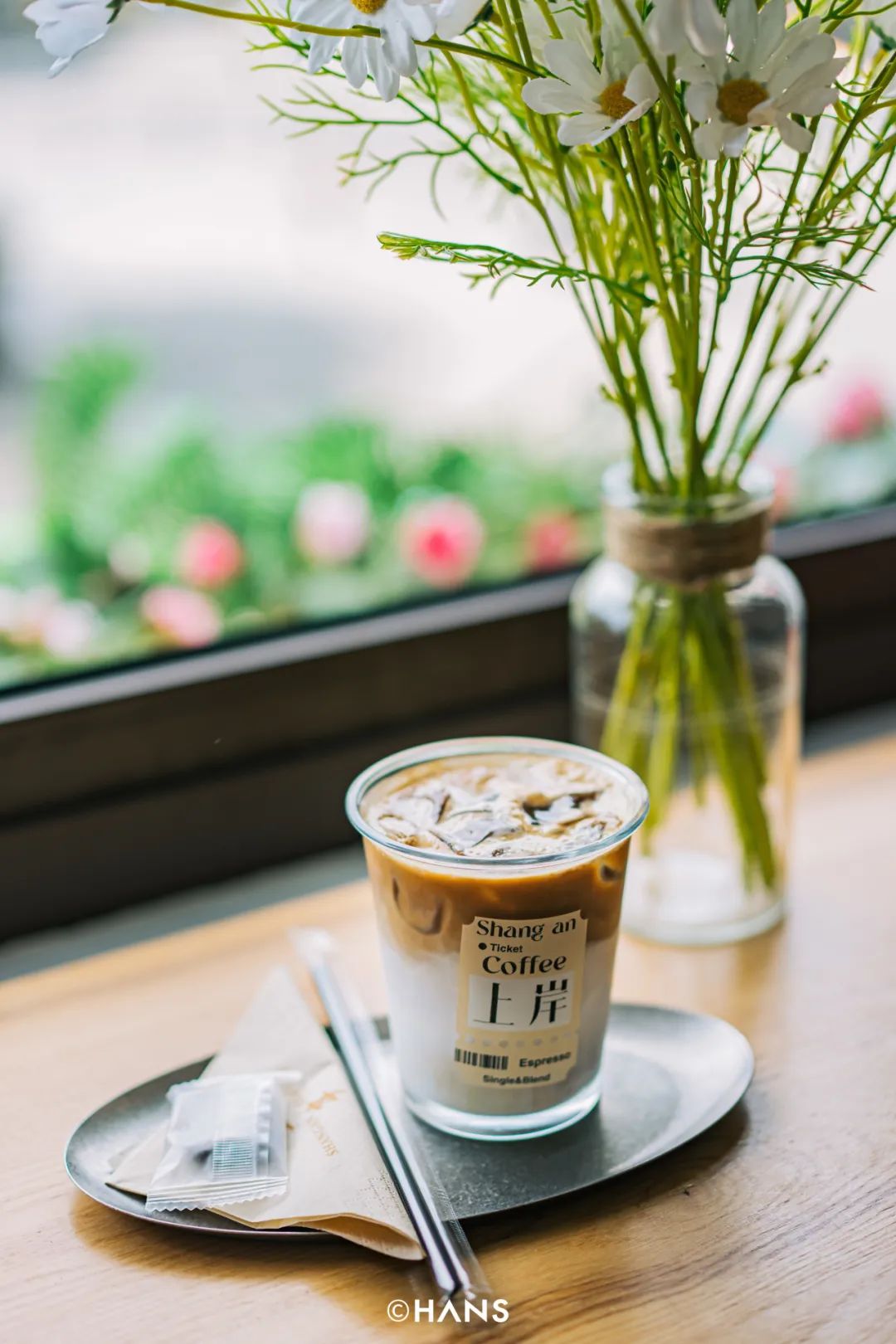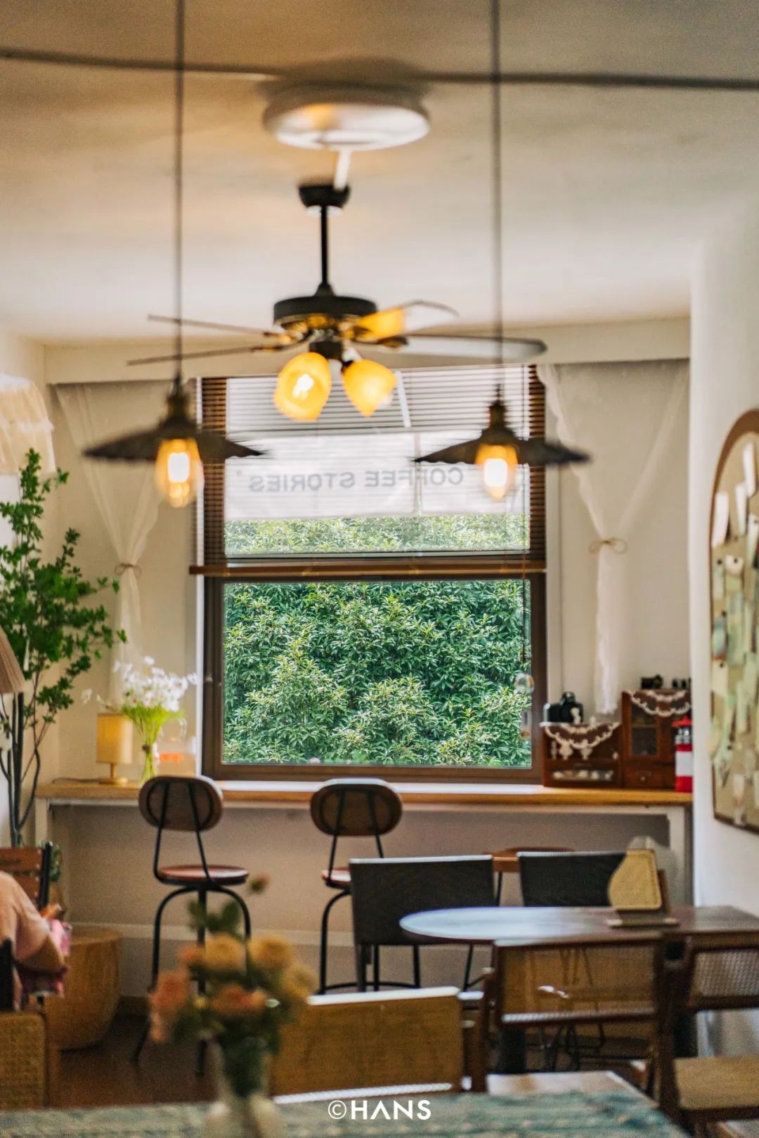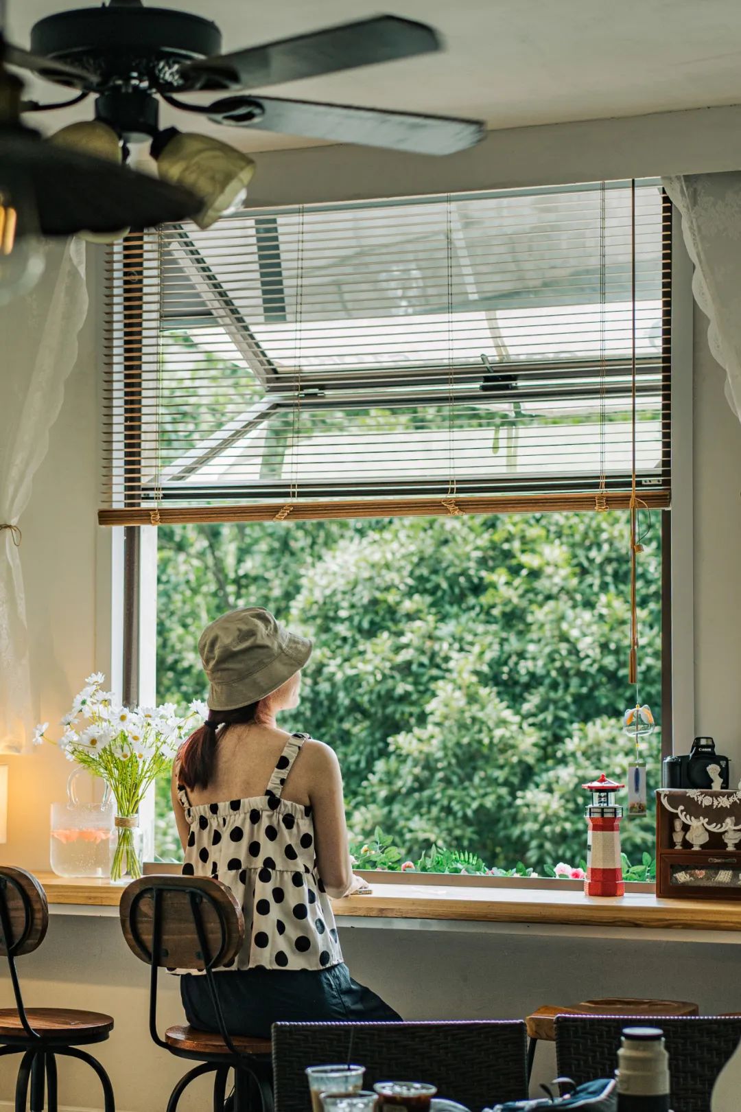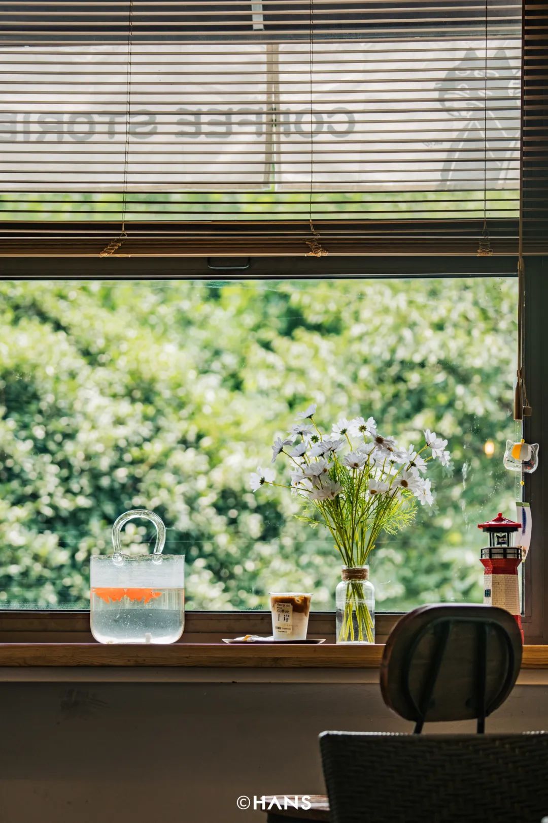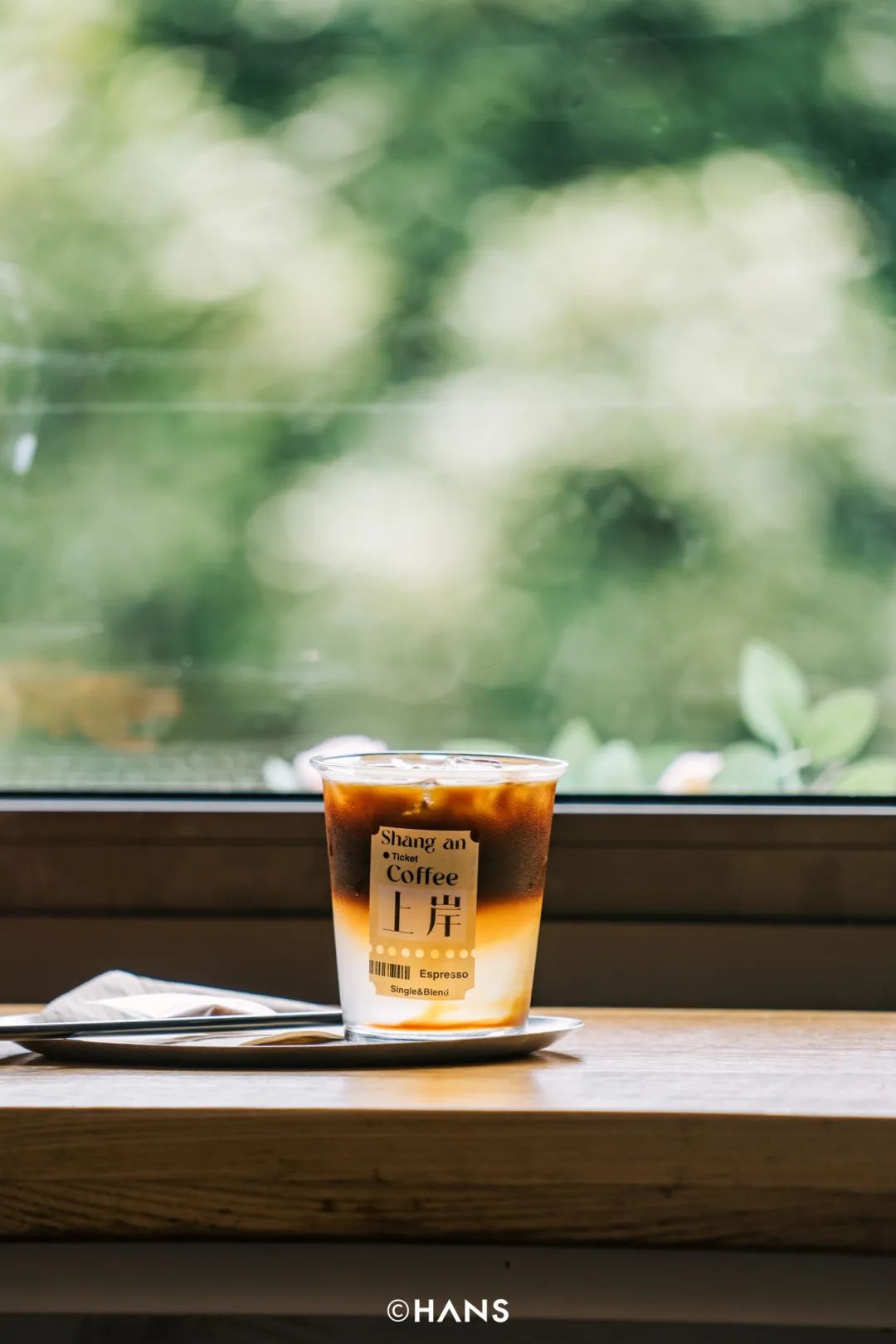 在上岸咖啡的二楼,有一扇方方正正的窗,铺满了一整片绿色,像房间里凭空长了一棵树。一阵风吹过,树叶的“沙沙”声混合风铃声,像投影仪投到墙上的屏保发出的白噪音,美得不真实。