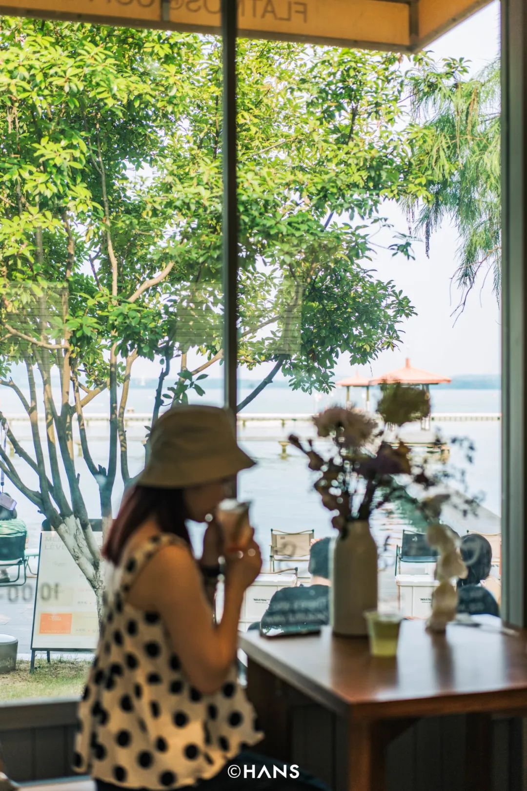 穿着救生衣的人推门而入,头发湿漉漉的,一瞬间闻到了湿热的湖风,玻璃结界被打开,才恍然自己坐在咖啡馆里,而不是东湖里。他点了一杯咖啡带走,说等下去桨板上喝,野中带chill。有两个漂亮妹妹问能不能坐在我们这儿拍张照,她说观察了所有桌子,我们这扇窗外的东湖最像海。