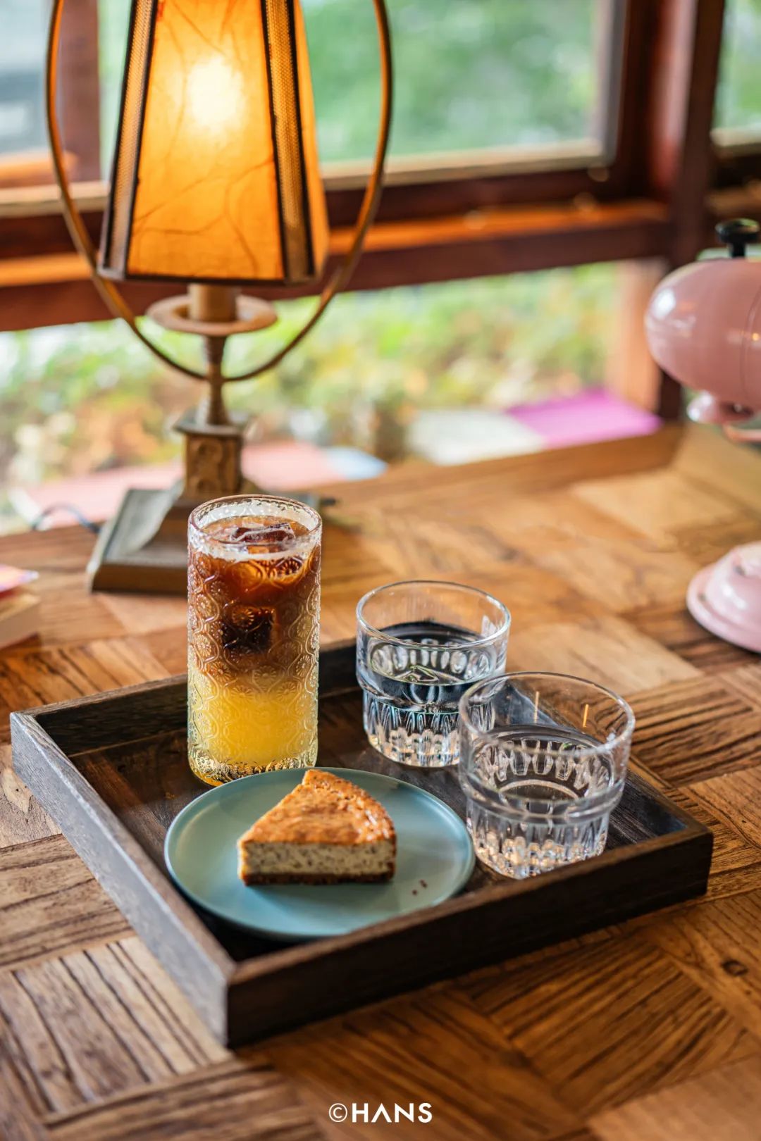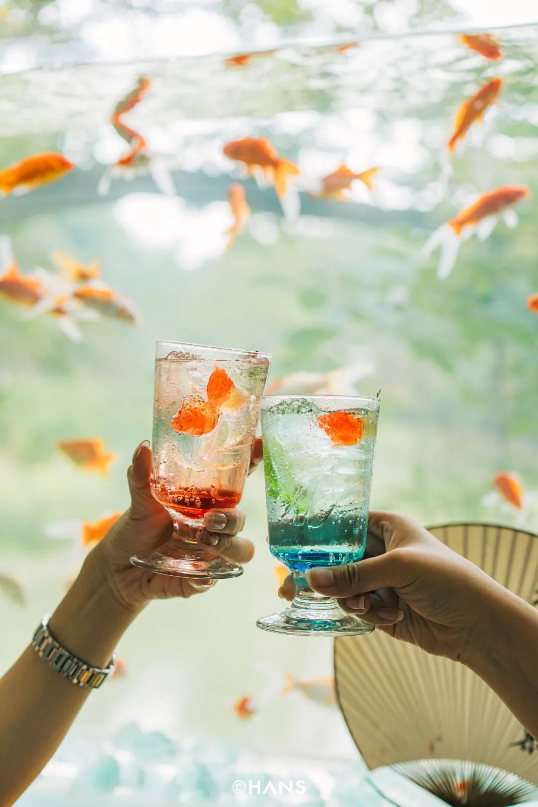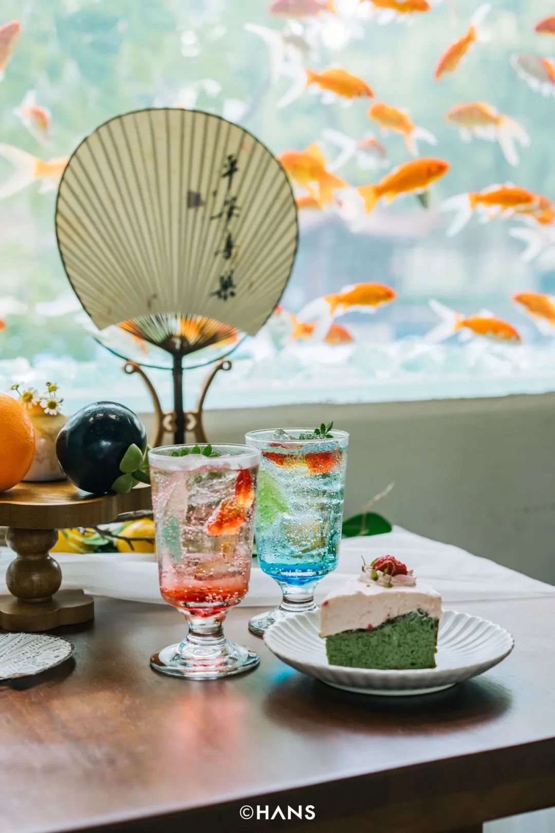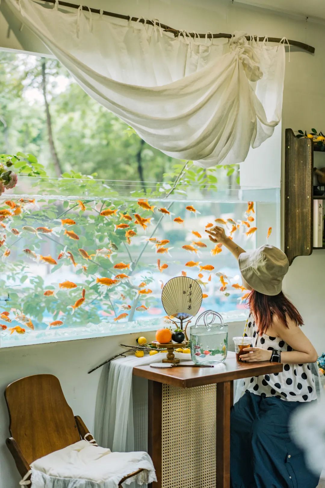 最近,赫尔茶咖突发奇想,选择了一扇面对解放公园湖面的窗子进行改造,做成了透明鱼缸。金鱼在窗中游,一下去天上,一下进树里,穿梭于解放公园的亭台楼阁中。红色的小金鱼很灵动,往每个坐在窗前的人身边绕,这一绕,就绕来了数不尽的王家卫和小王菲。