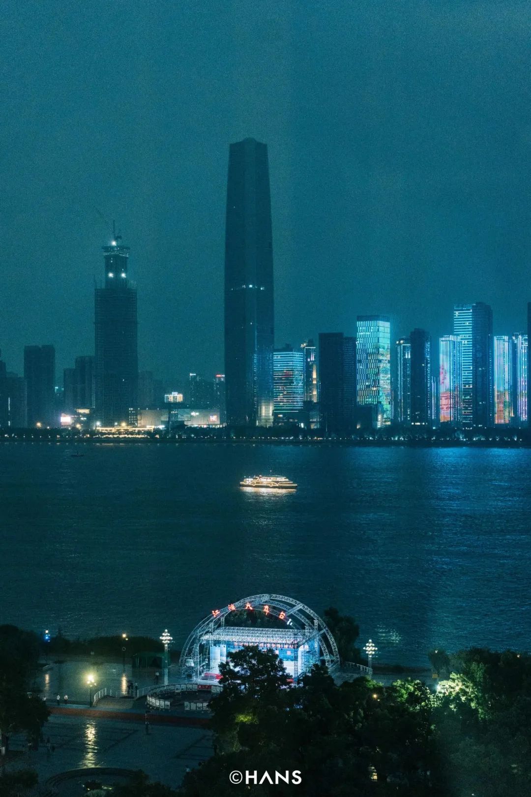 其实每天回家路上都会看到灯光秀,但今天格外不同,和以往零零散散出现的形象不同,它们整整齐齐在你对面站成一排,凑出一张完整的屏幕。红橙黄绿青蓝紫,映在楼宇之上,长江之中,天由蓝到灰,由黄到绿,江色随天色和光色而变换,一艘艘轮渡划开江面,每一道波浪都发出彩色的光晕。