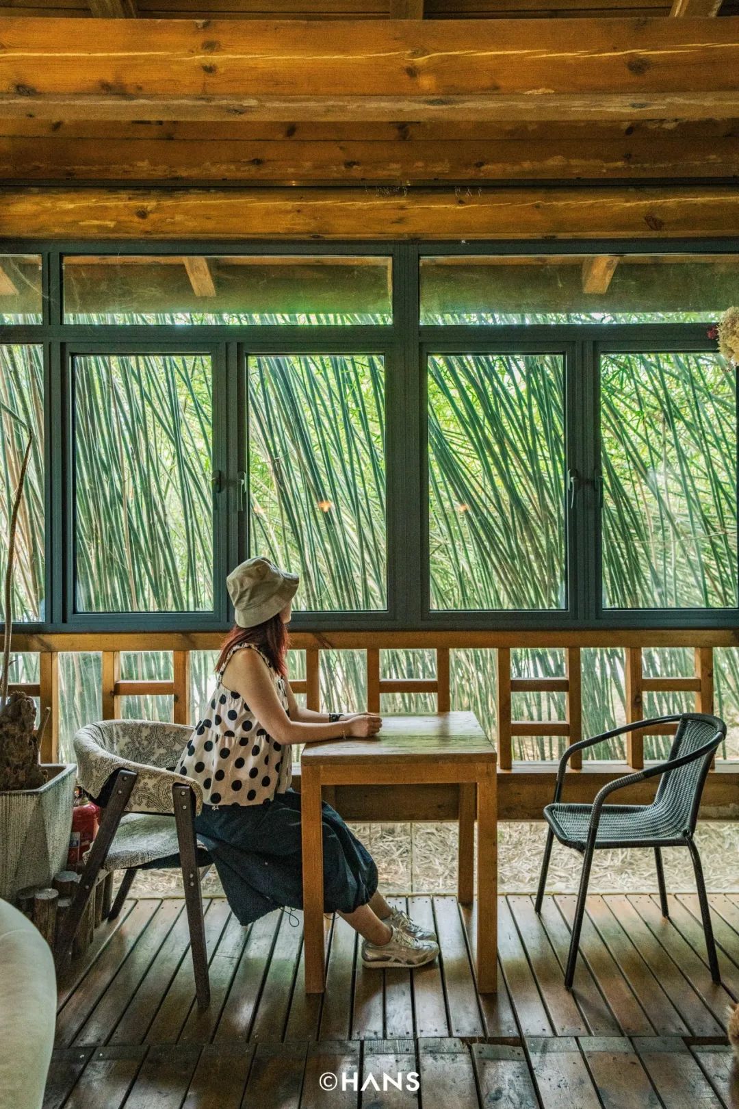 如果不是特意找来,很难发现武昌中心还有这样一所世外桃源。木屋的四周特意做成了落地玻璃,任何一扇窗,都是一副中国水墨画,竹子专场。一阵风起,你能看到竹林婆娑,沙湖上有人泛舟清扫浮萍,像身处电影《十面埋伏》之中。