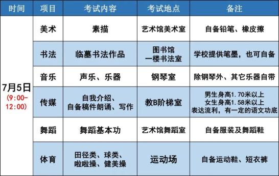 2. 美术、书法考生所需工具材料自备,音乐考生自备乐器(钢琴除外),体育考生招收田径、篮球、乒乓球、足球项目。