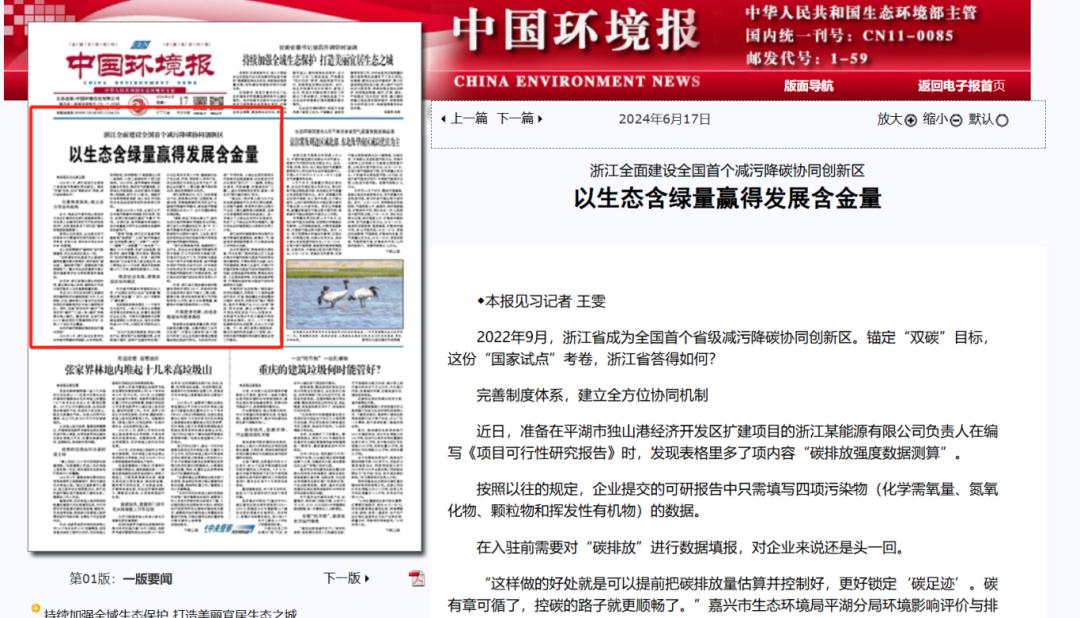 《中国环境报》头版头条:浙江全面建设全国首个减污降碳协同创新区 以生态含绿量赢得发展含金量