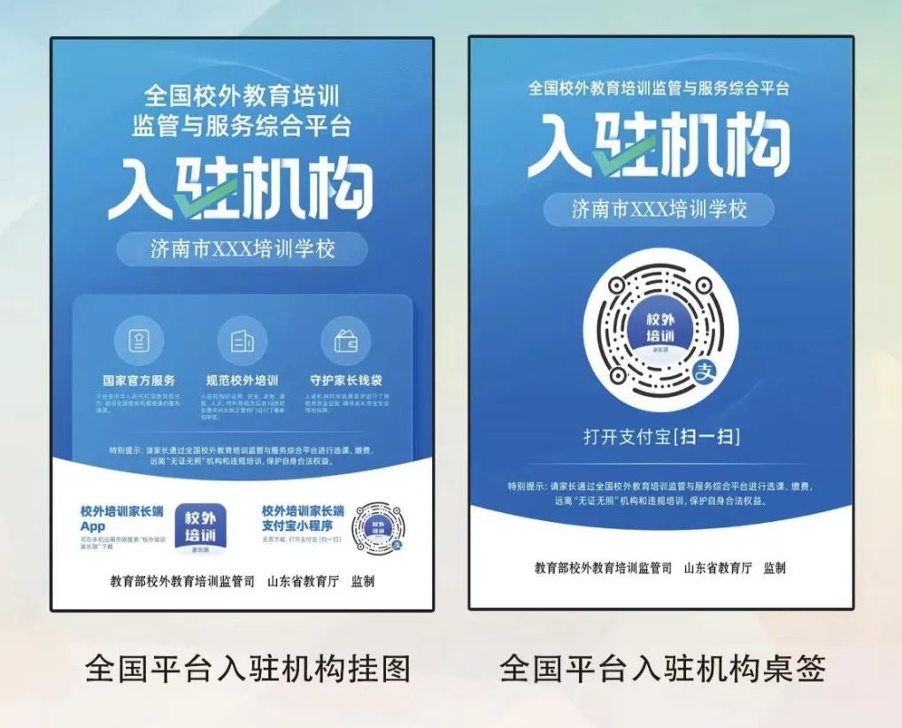 如需给孩子选择校外培训机构,请选择在济南市教育局或区县人民政府网站公布的“白名单”中的各类培训机构。报名时请务必查看该机构在前台摆放的“全国校外教育培训监管与服务综合平台入驻机构”台签和在醒目位置悬挂的“办学许可证”及“营业执照”。切勿选择“教育咨询公司”“教育科技公司”等“证照不全”机构,确保您和孩子的合法权益不受侵害。