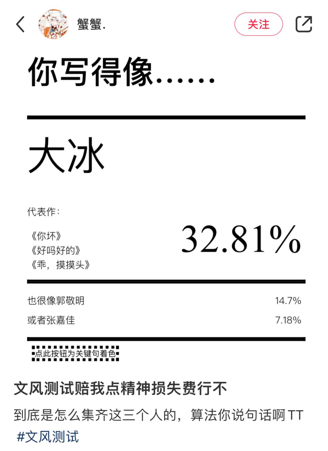 Ta 的测试结果集齐了大冰、郭敬明和张嘉佳这三位青春疼痛文学作家,这让 Ta 发出灵魂一问:「到底是怎么集齐这三个人的,算法你说句话啊」,还表示「文风测试赔我点精神损失费行不」。