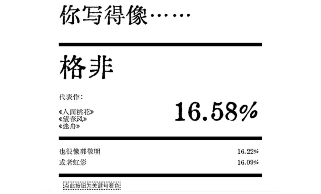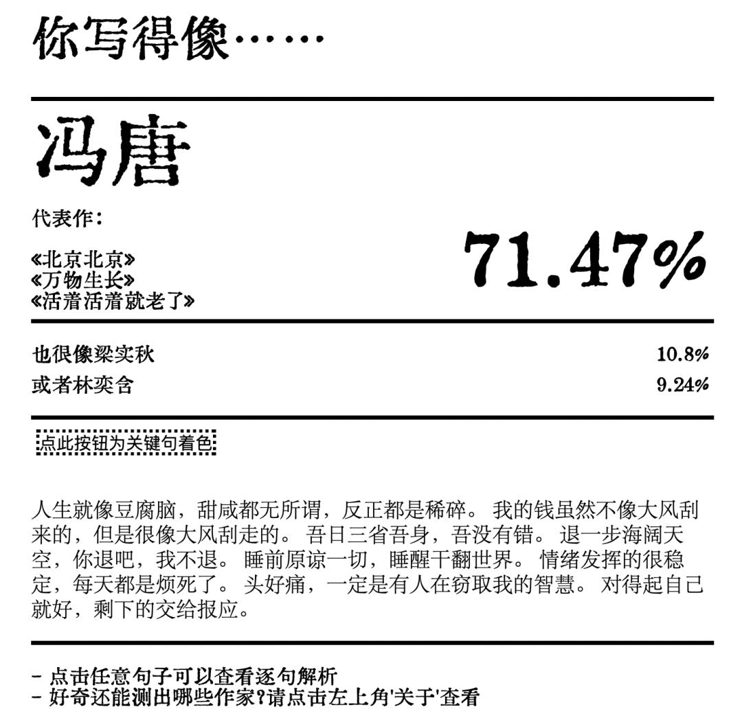 其实,这款文风检测器火得也不是没有道理。有人为了娱乐,有人则找到自我赏析和互评的契机。