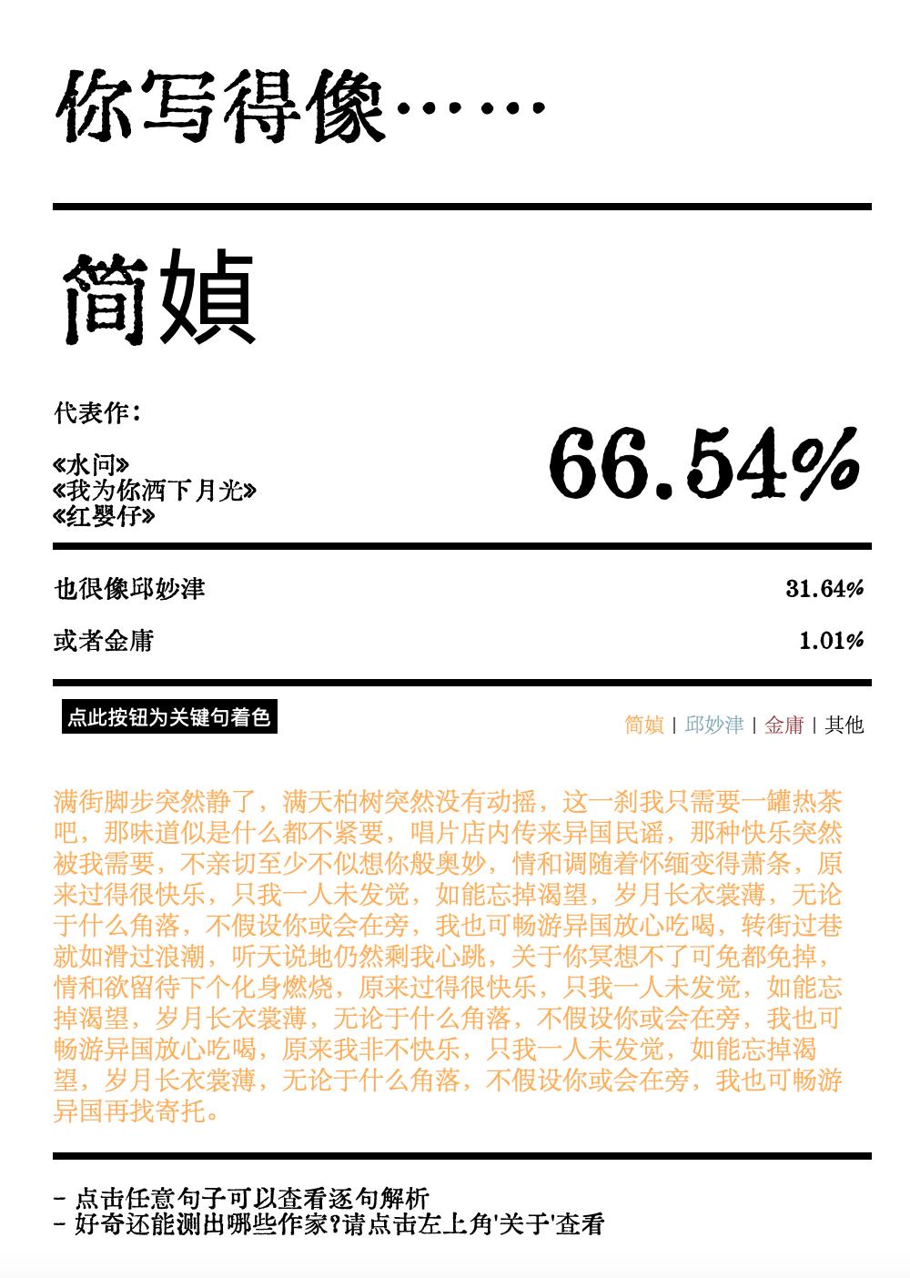 小编把之前稿件里的句子输入进去,和郭敬明文风相似度达 31.19%,还像邱妙津或大冰。(算你狠)