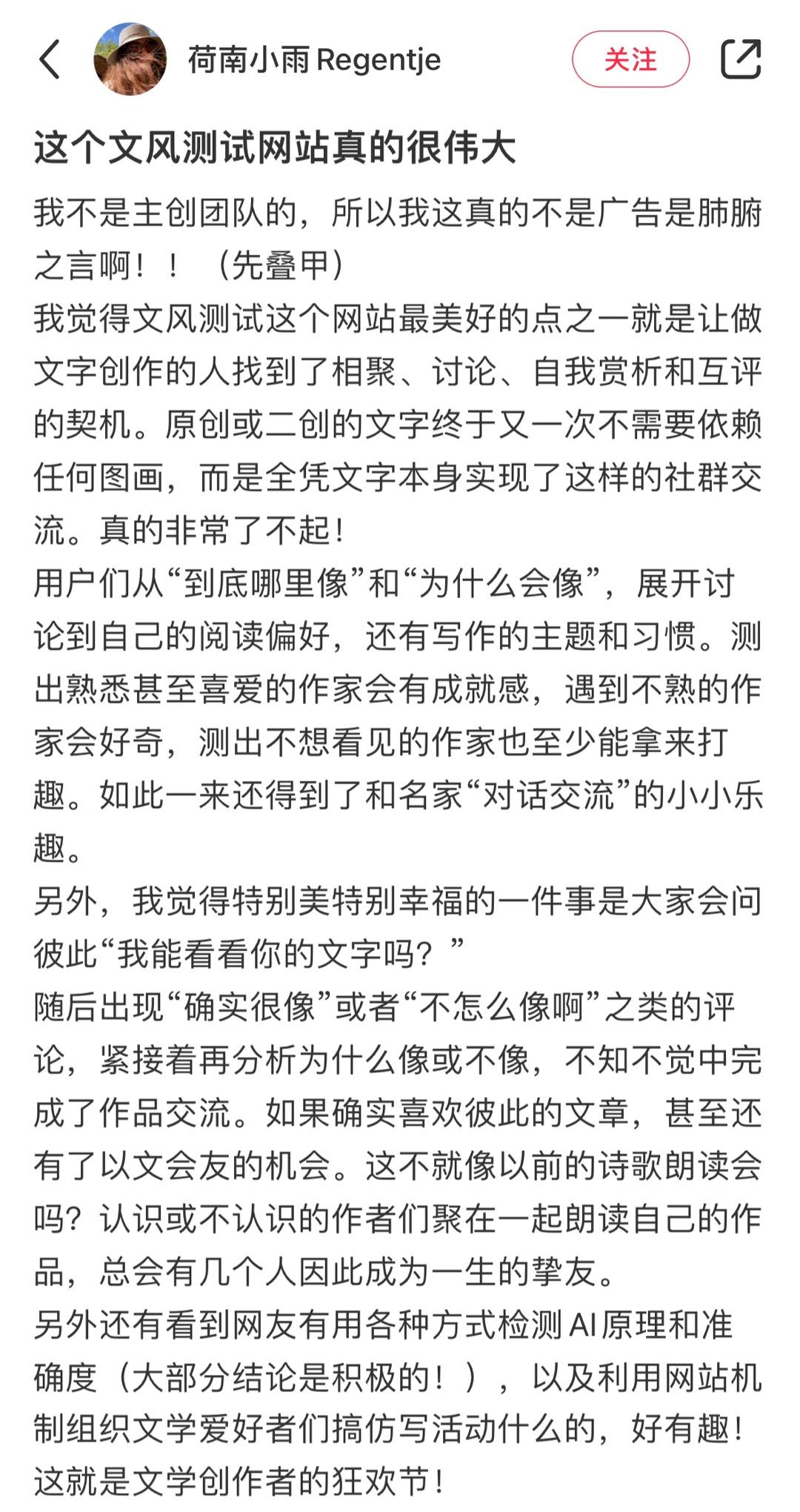 小红书博主「荷南小雨 Regentje」认为,文风测试这个网站最美好的点之一,就是让做文字创作的人找到了相聚、讨论、自我赏析和互评的契机。原创或二创的文字终于有一次不需要依赖任何图画,而是全凭文字本身实现了这样的社群交流。