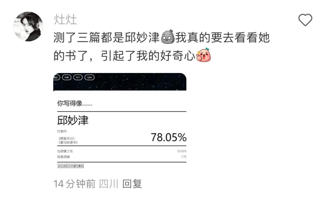 「用户们从『到底哪里像』和『为什么会像』出发讨论到自己的阅读偏好、写作主题和习惯。测出熟悉甚至喜爱的作家会有成就感,遇到不熟的作家会好奇。」