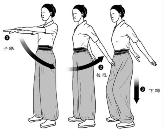 在连续摆臂五次后,当手向后甩的同时,双膝应微微弯曲,并轻松地进行上下蹲起动作两次。建议根据个人体力和舒适度,持续此套动作2~3分钟。