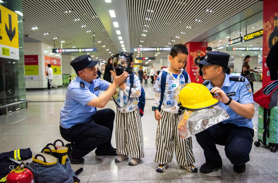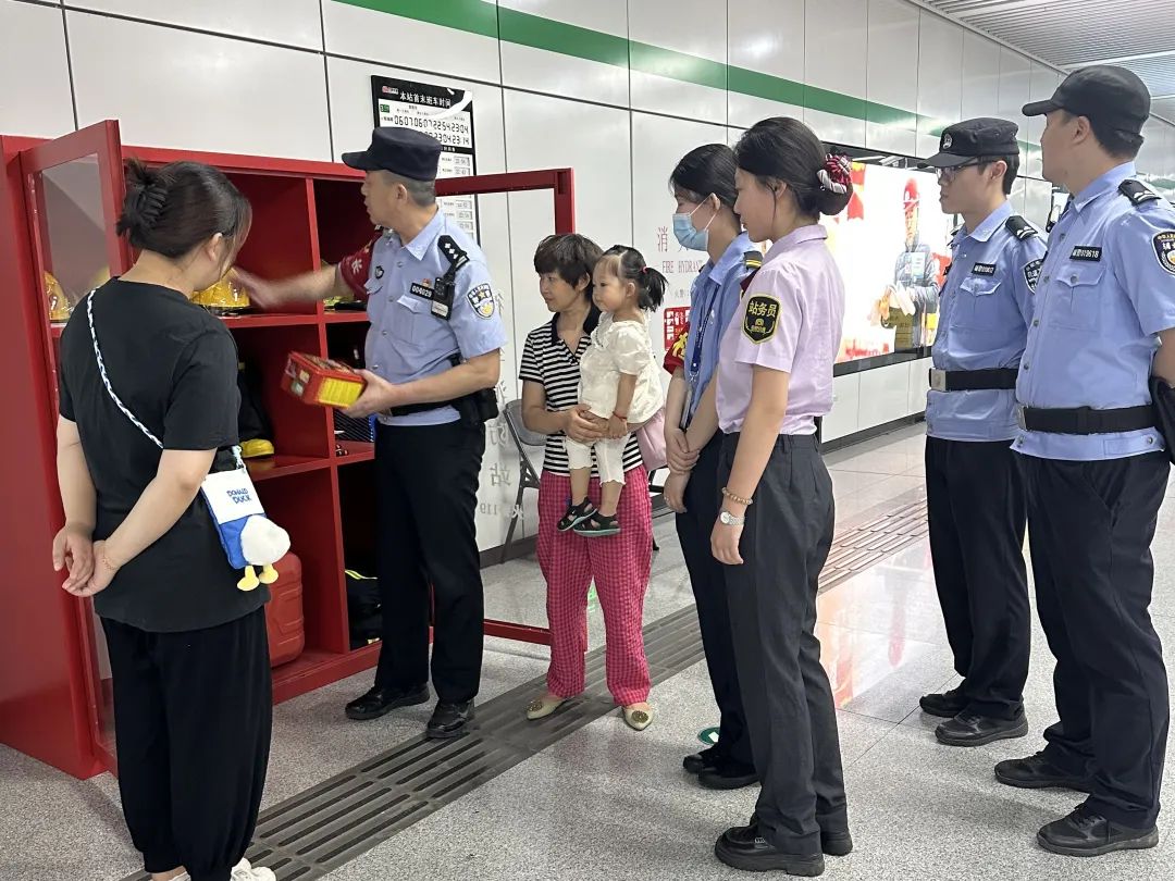 △ 合肥南站地铁站内,包河分局九联圩站派出所执勤警力正在为孩子们介绍消防应急装备。