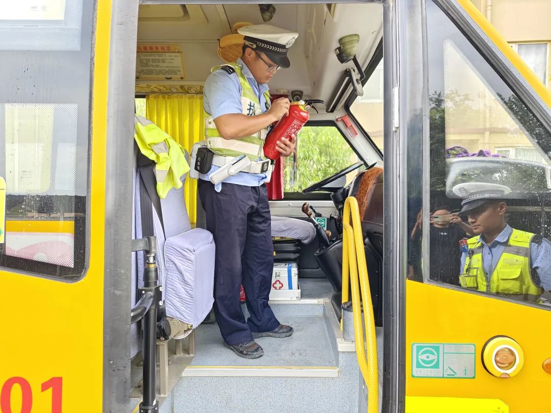 △长丰县公安局交管大队民警围绕校车维护保养、校车标牌、校车灭火器、安全锤以及急救箱配备等情况开展检查。