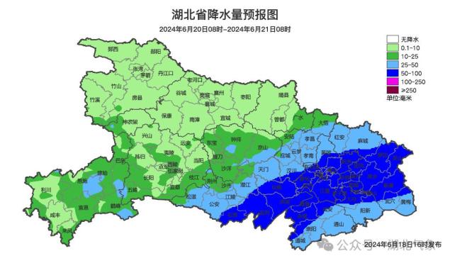 6月19日08时-20日08时,江汉平原东部、鄂东南阵雨转中到大雨,局地暴雨,并伴有短时强降水、雷暴大风等强对流天气;鄂西北多云有阵雨或雷阵雨;其他地区阴天有小到中雨、局地大雨。最高气温西部31~33℃、东部27~31℃,最低气温22~26℃,偏东风2到3级。