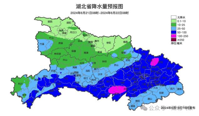 6月21日08时-22日08时,鄂西南南部、江汉平原、鄂东北、鄂东南阴天有大到暴雨,局地大暴雨,并伴有短时强降水、雷暴大风等强对流天气;其他地区阴天有小到中雨,局地大雨。最高气温28~31℃,最低气温22~26℃,偏南风3到4级、阵风5到6级转2到3级。
