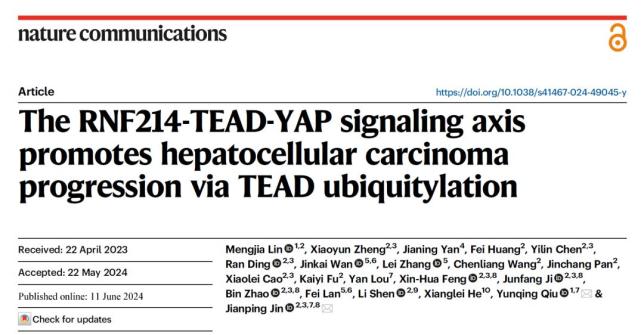 2024年6月11日,浙江大学生命科学研究院金建平课题组和浙江大学附属第一医院裘云庆课题组联合在Nature Communications上发表题为The RNF214-TEAD-YAP signaling axis promotes hepatocellular carcinoma progression via TEAD ubiquitylation的研究论文。该研究鉴定了Hippo信号通路新的重要调控因子——泛素连接酶RNF214;首次报道了转录因子TEADs生物学功能受泛素连接酶RNF214所调控,从而形成RNF214-TEAD-YAP的新信号轴。该研究证明了泛素连接酶RNF214通过上调YAP-TEAD复合体的转录活性,促进肝癌的发生发展。